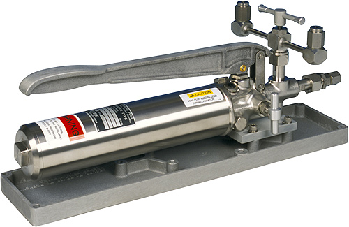 The Ametek Type T Hydraulic Pressure Pump may be ordered with either oil or a water/alcohol mixture as the pressure medium. There are three available seal packages for the system: Buna-N, Viton, and EPT. It features a dual pressure output manifold, fine adjustment vernier valve, relief valve, and dual volume control for rapid pressure increase at lower pressures and easier pumping at higher pressures.