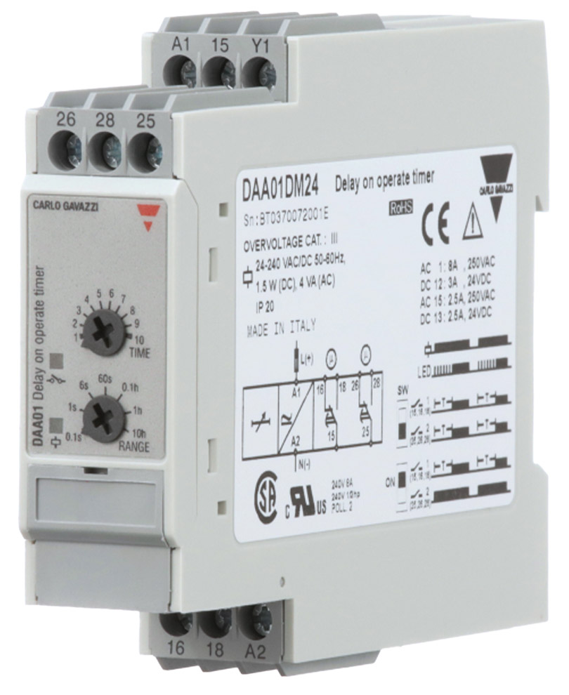 The Carlo Gavazzi DBB51 timer is a true delay on release timer with a knob adjustable time range from 1 to 10s. It has a combined AC and DC power supply, providing flexibility in installation and application. The DBB51 operates when the connected power supply is interrupted the set time period starts. At the end of the set time period, the relay will release. If power supply is reapplied before the relay releases the time is reset and the relay will remain on.