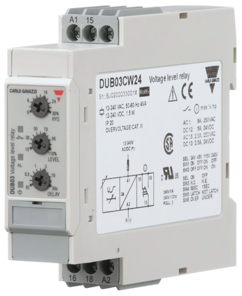 The Carlo Gavazzi DUB03 monitoring relay is a one-phase, TRMS AC/DC overvoltage or undervoltage relay. The DUB02 has a selectable measuring range as well as adjustable voltage. The latch function allows the ON-position of the relay output to be maintained. The inhibit function can be used to avoid relay operation when conducting maintenance or swapping out hardware.