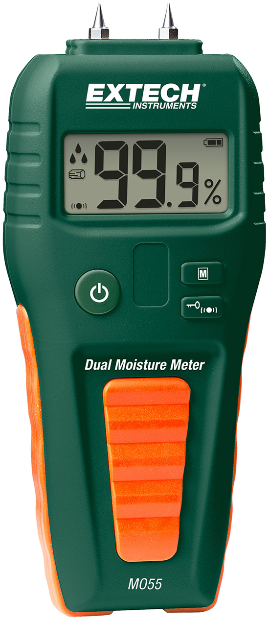 The Extech MO55 Moisture Meter takez quick moisture measurements on wood and building materials with choice of pin or pinless (non-invasive) method. Easy-to-operate with display icons that indicate the levels of moisture content plus audible alert feature. Ideal for building restoration projects and applications where moisture detection on floors, tiles and under carpets is critical. A must-have tool for analyzing the after-effects of water leakage behind walls and in ceilings.