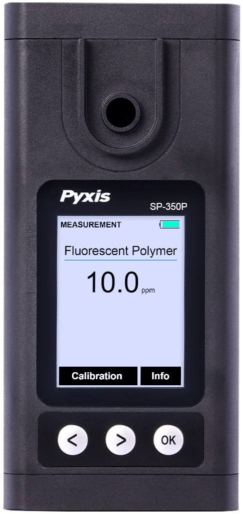 The Pyxis SP-350P and SP-380P Fluorometers are simple to use handheld fluorometers offering direct measurement of fluorescent polymers used in cooling and process water applications. These devices have a built-in sample cell allowing samples to be directly filled in, eliminating the need for purchasing and using sample cuvettes. The SP-350P is a single channel fluorometer which measures fluorescent polymer only (0 to 20ppm) while the SP380P is a dual channel fluorometer which measures both PTSA (0 to 300ppb) and fluorescent polymer (0 to 20ppm). This patent pending technology combines cutting edge optical measurement of both fluorescent tracers commonly used in cooling and process water applications in one easy to use platform while compensating for color and turbidity interference commonly present in real-world waters.