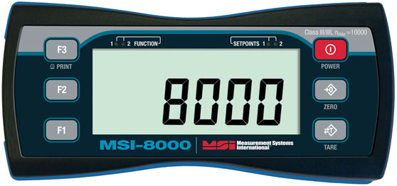 The Rice Lake MSI-8000 remote display uses wireless control to operate weighing systems from a distance. The wireless remote display can be used for viewing MSI ScaleCore-based crane scales and dynamometers, including any RF compatible MSI-3460 Challenger 3 or MSI-7300 Dyna-Link 2 tension dynamometer. Both devices are compact and carry an RF effective range of 300 feet (line of sight) and operate on a license-free 2.4 GHz frequency. With user-friendly keypads, standard function keys for both devices include: On/Off, Zero, Tare and Print. In addition, two user-defined keys are included for peak hold, high resolution, total, view total, net/gross, and units switching. Three selectable setpoints come standard in both models, with two of the selectable setpoints utilizing the programmable user-defined keys.